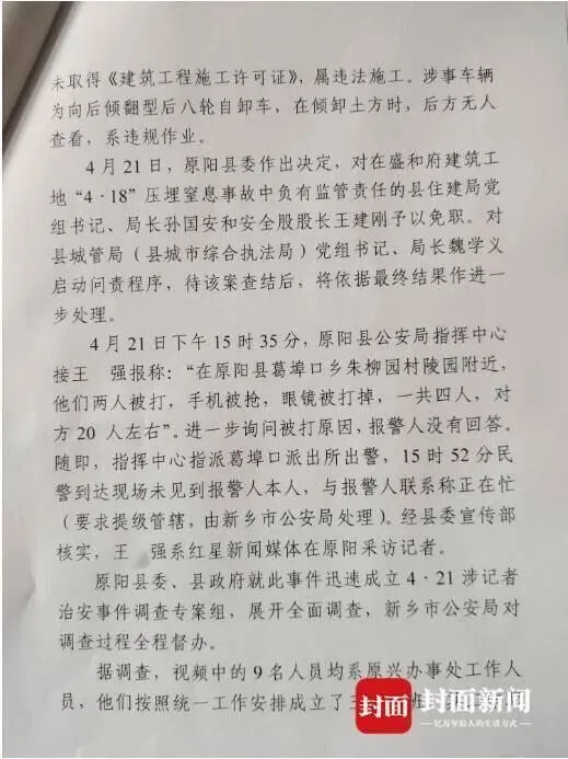 今天,河南原阳县委宣传部向封面新闻出具《“关于原阳县盛和府建筑工地“4·18” 压埋窒事故”情况说明》,对“4·21涉记者治安事件”作出回应称,涉事9名人员均系原兴办事处工作人员。