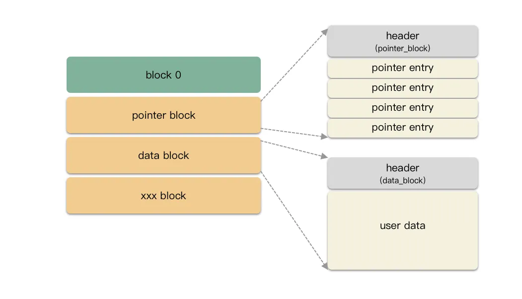 pointer block:树的分支,指向下一个 block; -