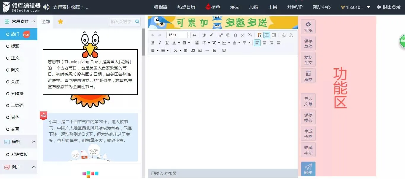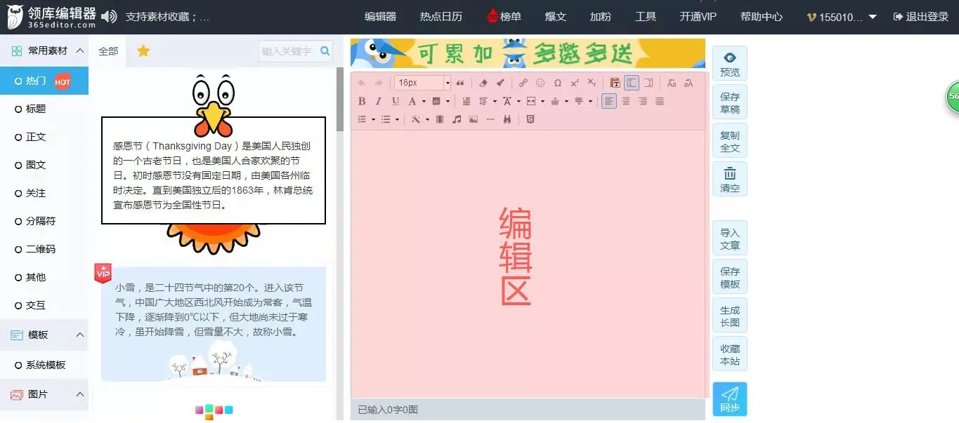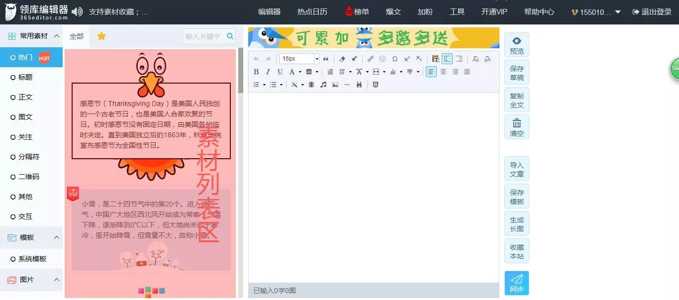 提供素材展示,点击素材即可插入编辑区,进行编辑。