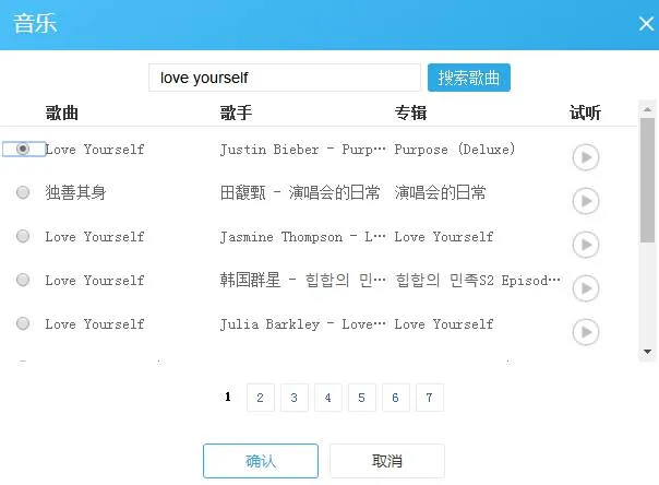 插入音乐:点击此处插入音乐,在弹出框中搜索所需音乐,选中音乐,点击确认,即可插入成功。