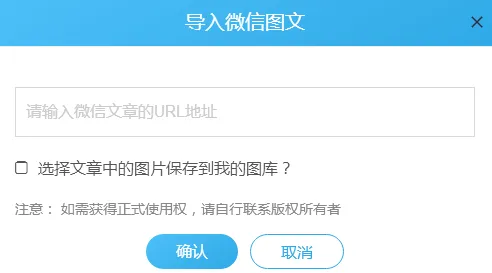 粘贴文章网址(打开手机端或电脑端,公众号图文消息,手机端点击上方右侧按钮,手机屏幕下方出现界面,点击复制链接地址即可获得文章链接地址;电脑端,点击该文章后,点击左侧上方复制链接地址按钮即可获得),点击确定,即可导入微信文章。