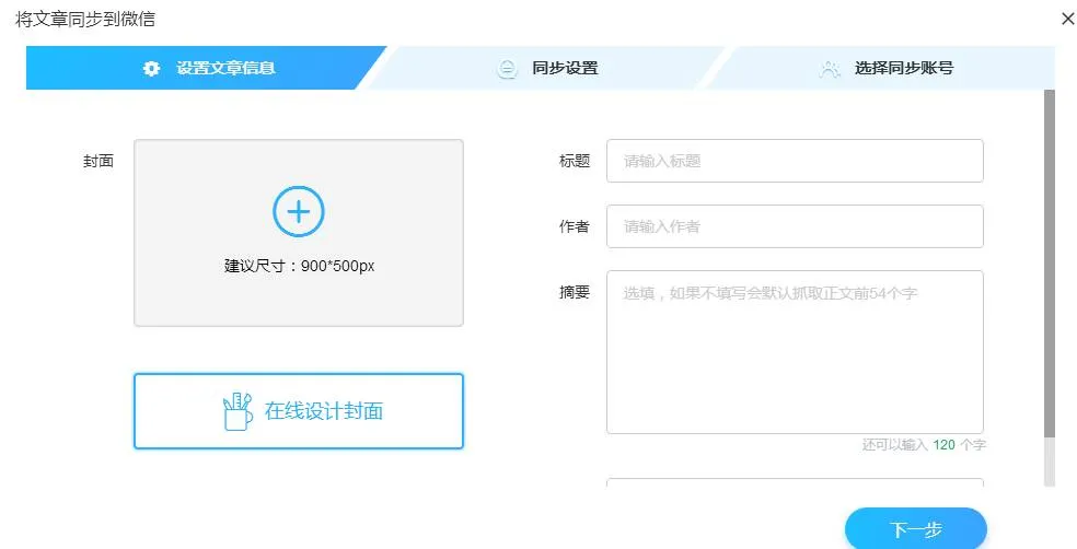 同步按钮:点击同步按钮,即可设置文章封面图、标题、作者及摘要,设置完成后,点击下一步,若无授权公众号,则需扫码授权公众号,若已授权公众号则无需二次操作,点击将要发布文章的公众号,点击下一步,出点同步成功,及可将图文,同步到微信后台的素材管理中。