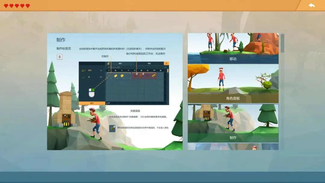 像大多数沙盒游戏一样,本作的游玩节奏完全取决于玩家的探索进度。但这也导致了新手玩家经常陷于迷茫的境地,为此,游戏内精心设计了指南系统。让即使没有生存沙盒游戏经验的玩家,也能根据指南系统中的教程熟悉探索模式的基本玩法。