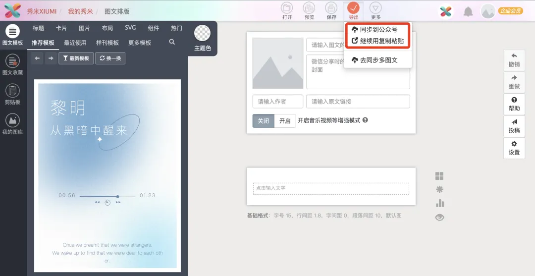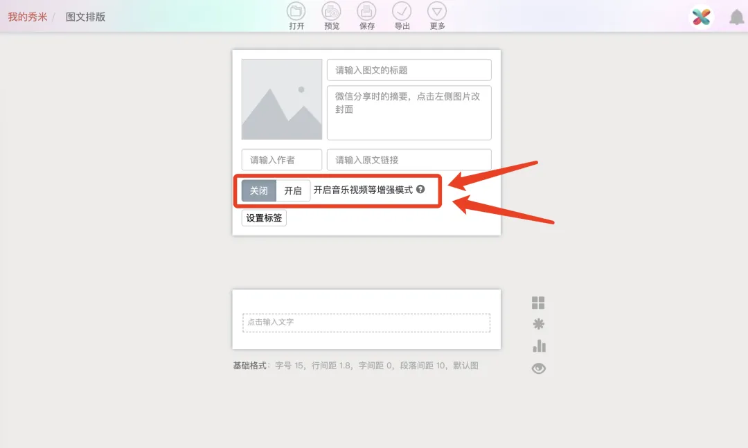 相对于公众号图文,秀米图文还拥有独一无二的增强模式,可以设置背景音乐、添加本地视频、拥有更多字体与表单支持等等设置。