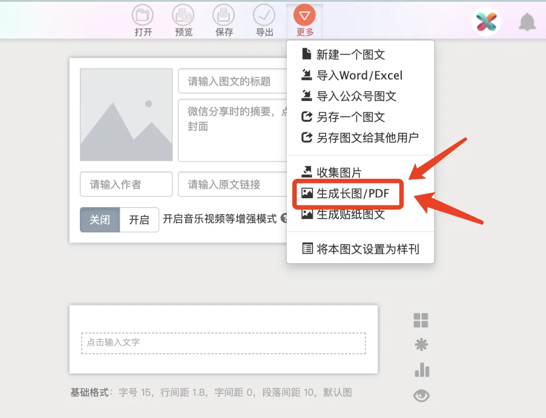 生成长图/PDF入口,是在秀米图文编辑界面,顶部更多里;按需操作就好。
