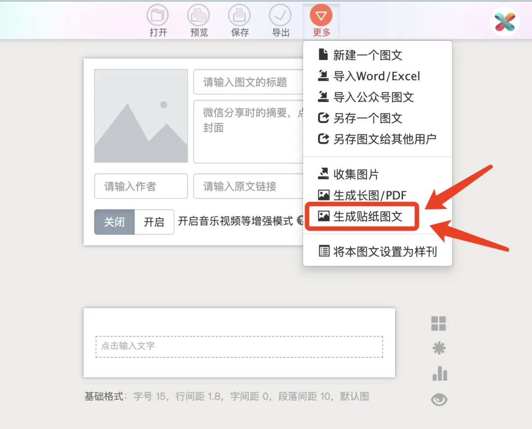 贴纸图文,是将一篇图文里带模板格式(标题、图片、卡片,或是用到布局)的部分转化成图片,正文部分保留为文字。