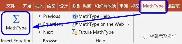 一般来说,在Mathtype安装完成后,可以在菜单栏中看到一个菜单项,如图1显示的PowerPoint菜单栏和图2的Word菜单栏.