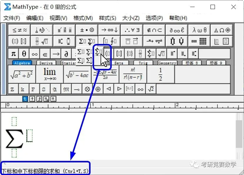 一般直接通过点击工具栏上的快捷输入图标,通过填空的方式可以实现公式和数学特殊符号的输入.将鼠标指针移动到打开的按钮图标,会在左下角的状态信息栏中显示输入快捷键。图4显示为点击工具栏中的求和输入按钮,状态栏中显示此按钮的作用是“上标和中下标极限求和(Ctrl+T,S)”不仅给出了该图标按钮的功能说明,括号里面也给出了快捷键输入方式,即按下【Ctrl】的同时,再按一下【T】键,然后全部松开,再按以下【S】键,则相当于点击一下这个按钮,输入求和符号。