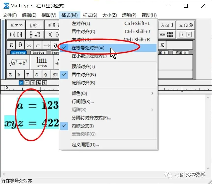 用于设置选中的部分公式的对齐方式、颜色、间距等属性。软件会自动识别输入的内容,然后根据设置自动设置格式,比如如图5中设置选择的两行对其方式为“在等号处对齐”,则选中的两行自动会在等号处对齐.