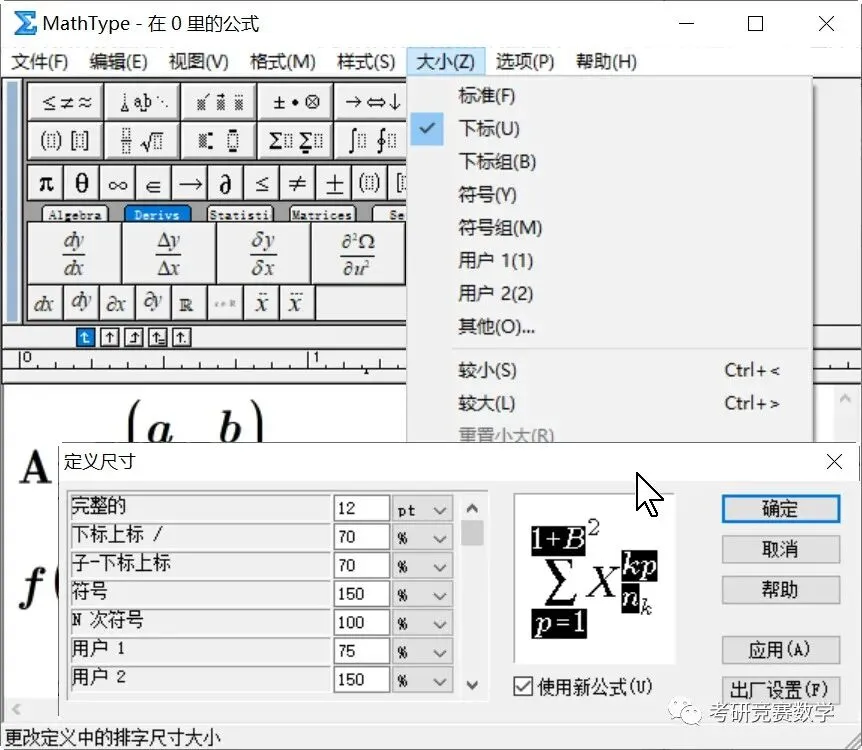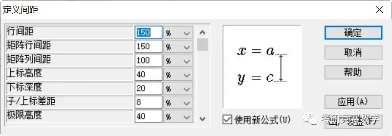 对话框以非常直观的形式显示了左边输入的数值所参数的格式效果变化。设置完成后,点击右侧的“应用”按钮将设置直接应用到选中的部分公式,点击“出厂设置”自动加载软件默认设置,而勾选“使用新公式”,则在点击“确定”后表示参数更改将在创建新的公式对象时自动套用这里设置的参数。后面相关设置面板中的相同名称按钮和选项作用及效果基本一致。