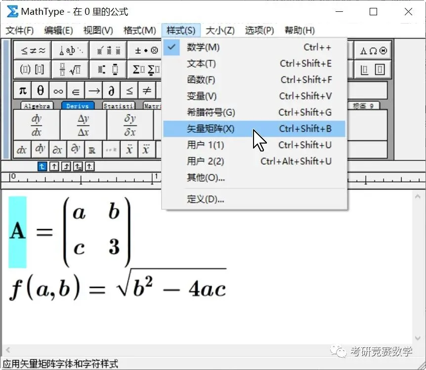 Mathtype公式中的字体大小与各类型样式通过“格式”、“样式”和“大小”三个菜单来实现。其功能说明如下: