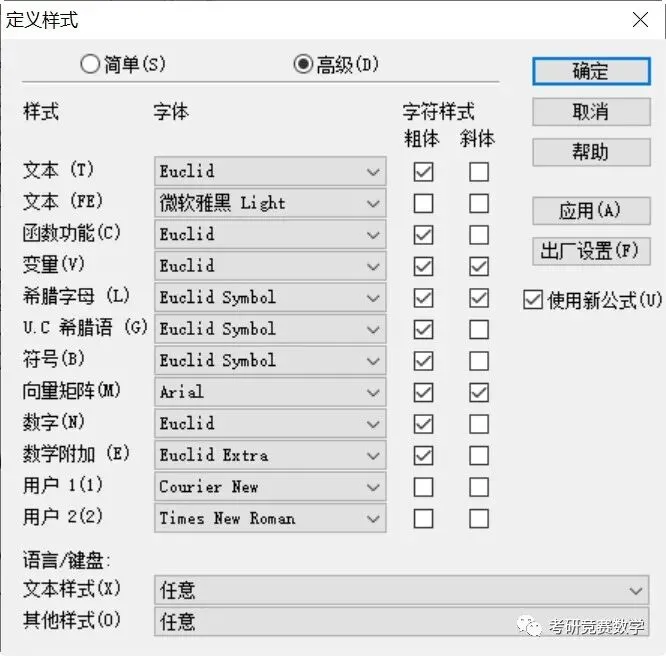 点击选择菜单中的选项,则按照对应选项预先设置参数设置选中公式部分的格式。软件也会部分自动识别输入的内容,根据输入自动设置格式。如果希望自定义字体、样式(粗体、斜体)则可以点击菜单最下面的“定义”选项,打开如图8所示的定义样式面板,在其中的“高级”面板中可以逐项设置字体与样式。