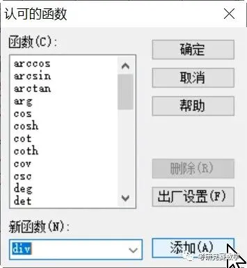 在最下面的“新函数”输入窗口中输入希望认定为函数的名称,如输入散度div,然后点击“添加”按钮,则将div添加到上面的函数认可列表,“确定”退出对话框后,在公式编辑区域输入div,则自动识别为函数并自动设置为函数样式。点击其中的“出厂设置”则恢复系统默认函数认可列表,用户添加的函数将被清除。