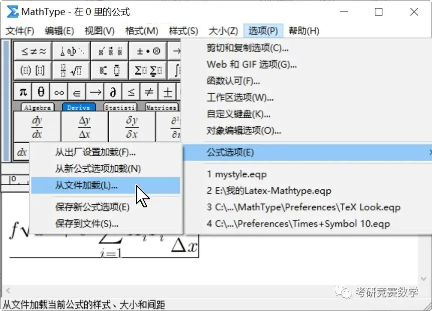 有时候根据文档的需求可能需要对公式设置不同的样式,或者在一台电脑上修改参数设置以后,希望将设置参数自动在其他电脑中应用,或者应用一些专业文档的专门样式来设置自己输入的样式,从而有效提升公式的编排效率。为此,Mathtype提供了“公式选项”模板设置文件保存、加载功能,具体操作如下: