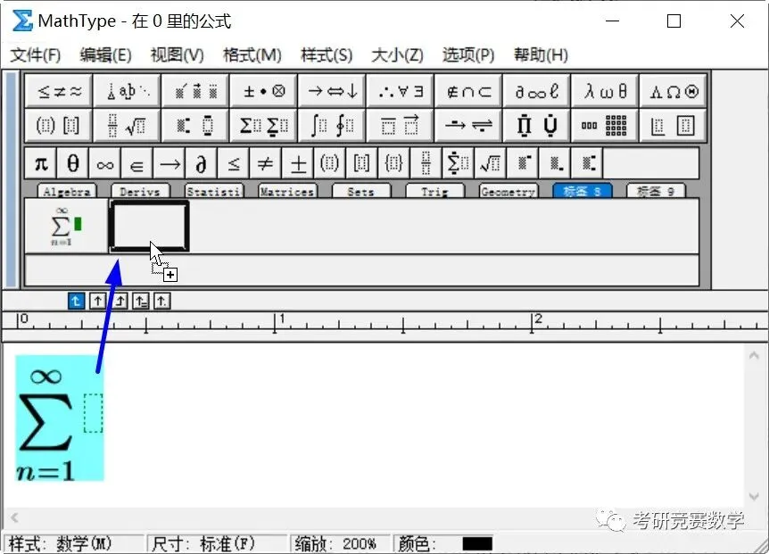 对于一些结构类似的公式的输入,比如级数求和表达式,只需要修改部分输入内容(如通项表达式)的时候,则可以直接设置为标签按钮,然后输入通项表达式即可。具体操作如下:
