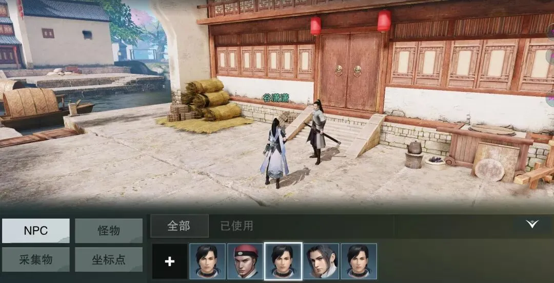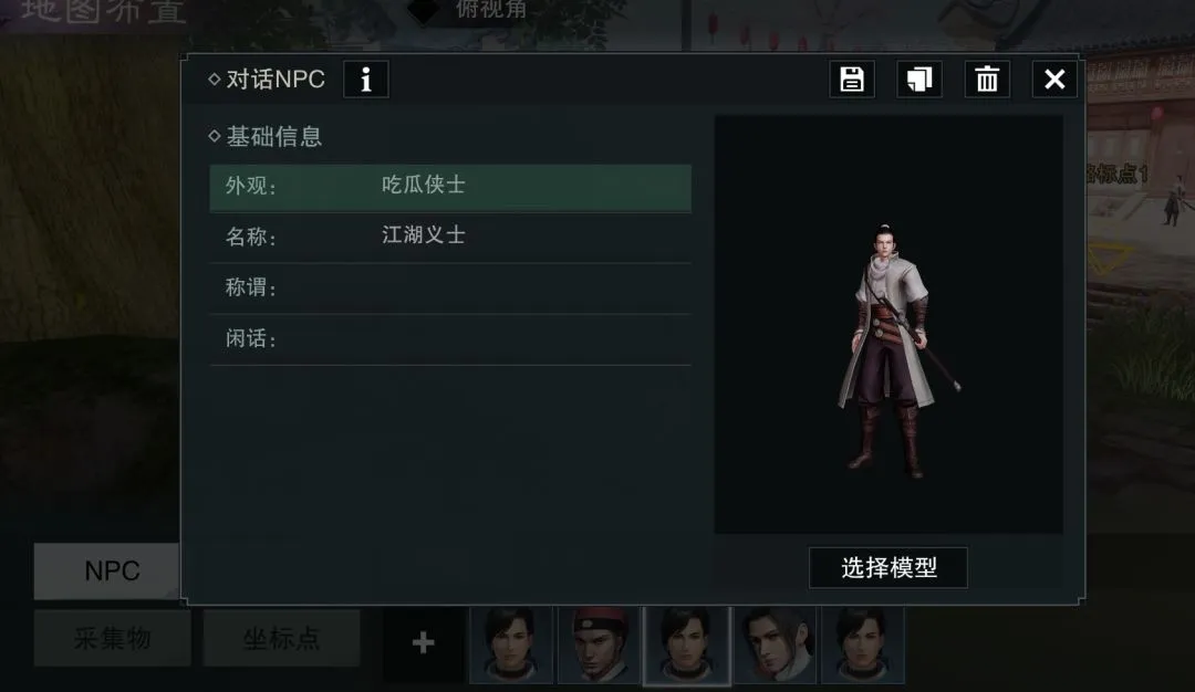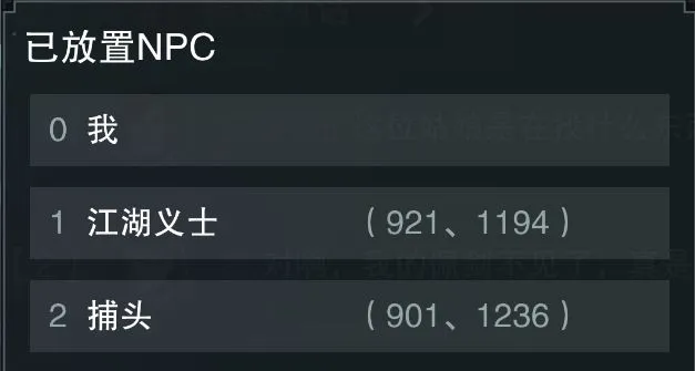第一步:事先安置好所需NPC的位置,三哥便先把“江湖义士”和“捕头”两位演员的站位和名称安排上~