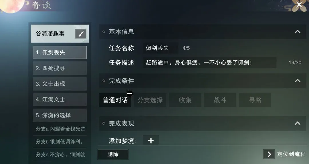 第二步:设置任务及其类型,少侠可以编辑任务名称、描述和完成条件,并通过对话、分支选择、收集、战斗和寻路来完成任务~