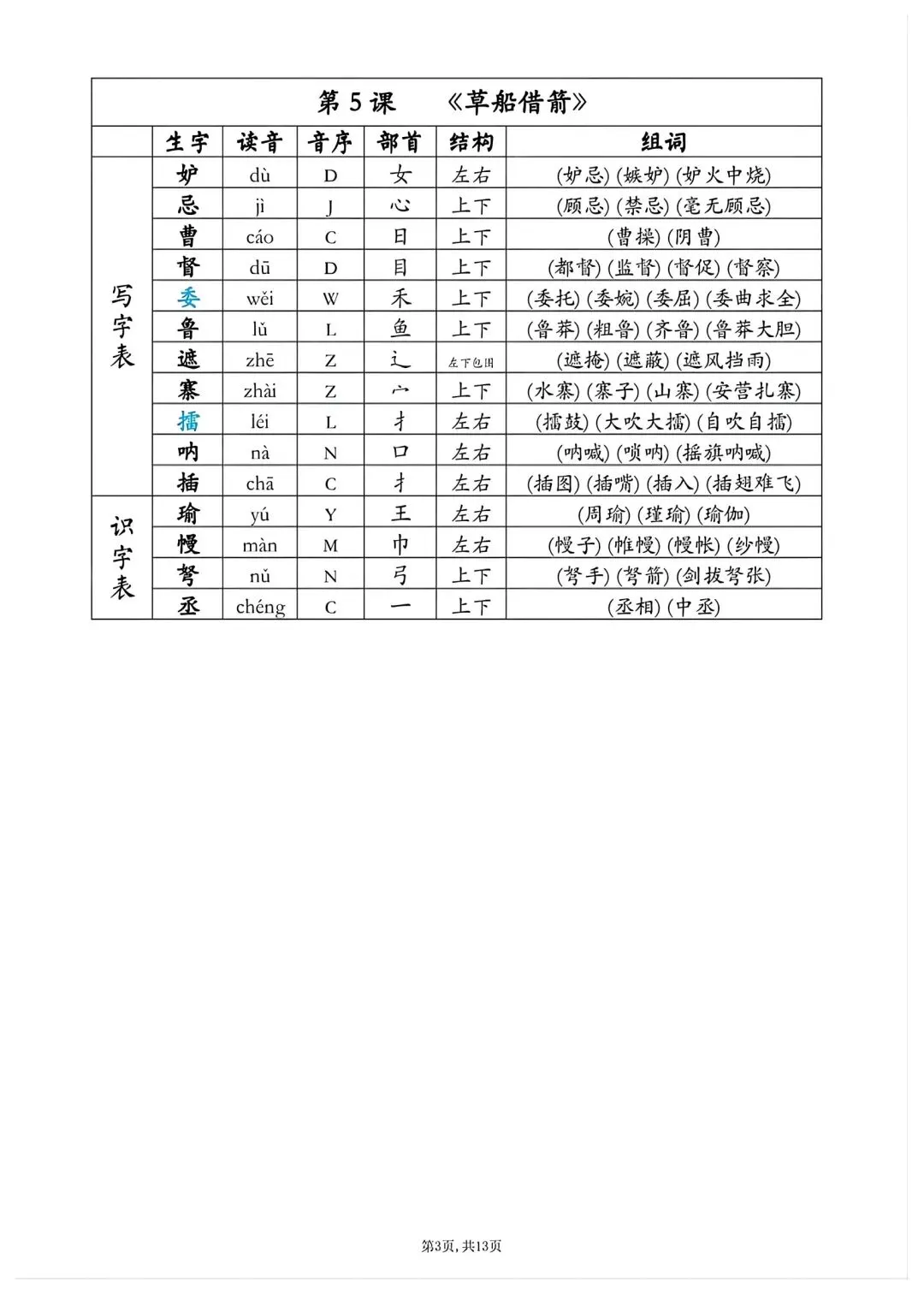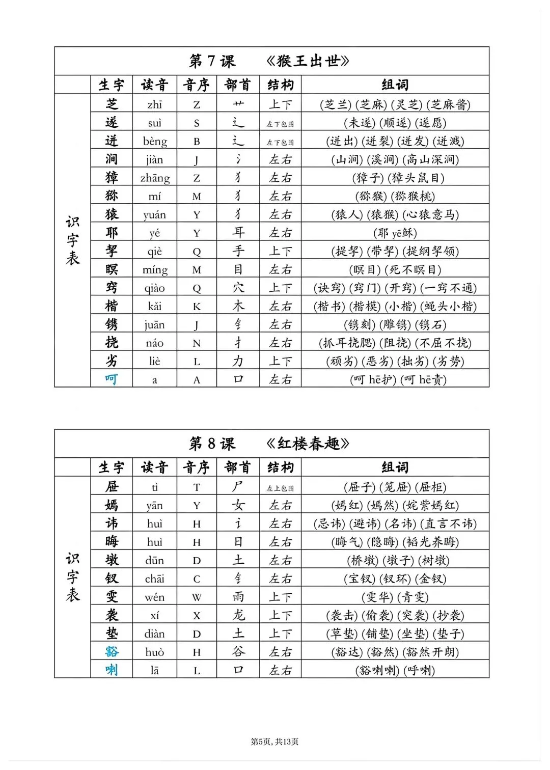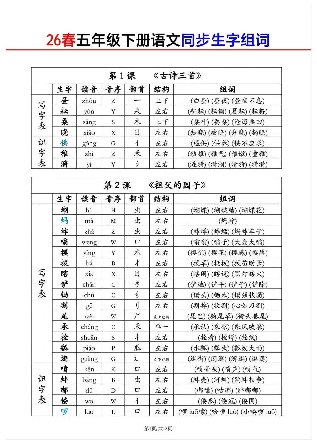 五年级下册语文同步生字组词高清电子版可打印