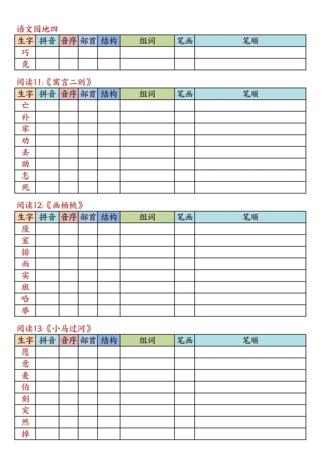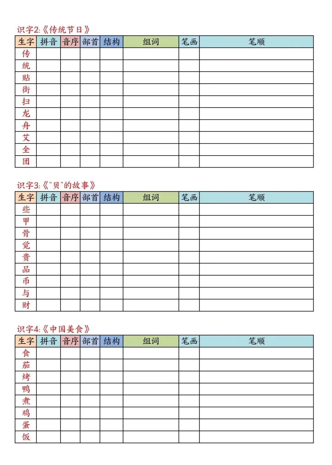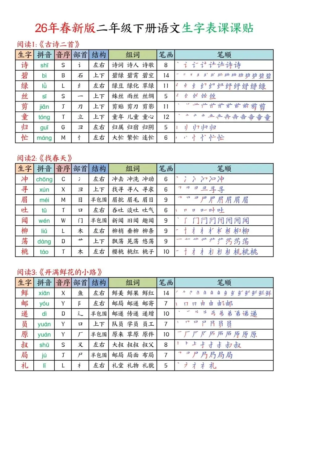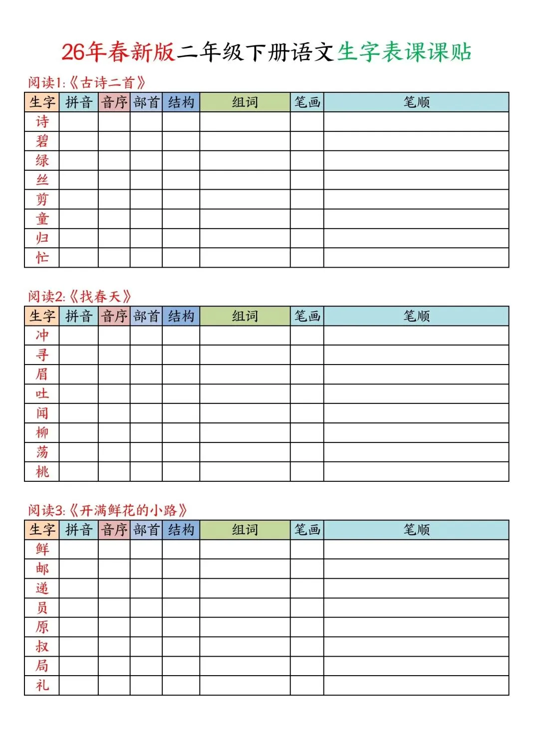 二年级下册语文写字表课课贴高清电子版可打印