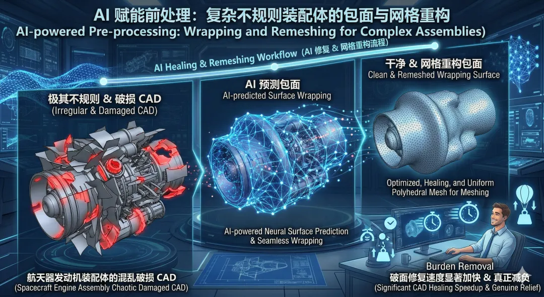 AI 赋能前处理:针对复杂 CAD 几何(尤其是咱们航天器、发动机这种极其不规则的装配体),新版增强了基于 AI 预测的包面(Wrapping)和网格重构功能,破面修复速度显著加快,真正做到了给工程师“减负”。