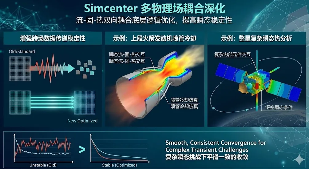 多物理场耦合深化:在流-固-热双向耦合的底层逻辑上进行了优化,提高了跨场数据传递的稳定性。对于像上段火箭发动机喷管冷却、整星热分析等复杂瞬态问题,收敛性表现得更加从容。
