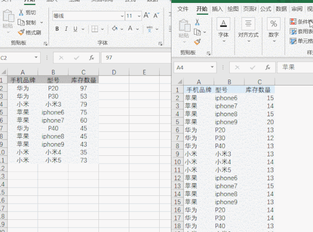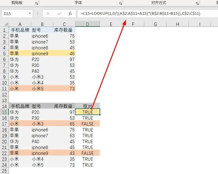 【例1】根据A列和B列,核对C列库存数量是否相一致。