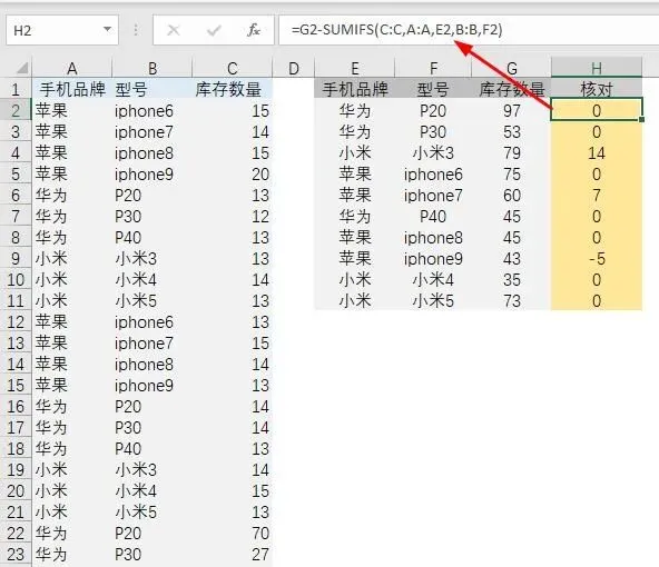 【例2】如下表,左表为明细表,右侧E:G列为汇总表,需要核对两表库存数量是否相一致。