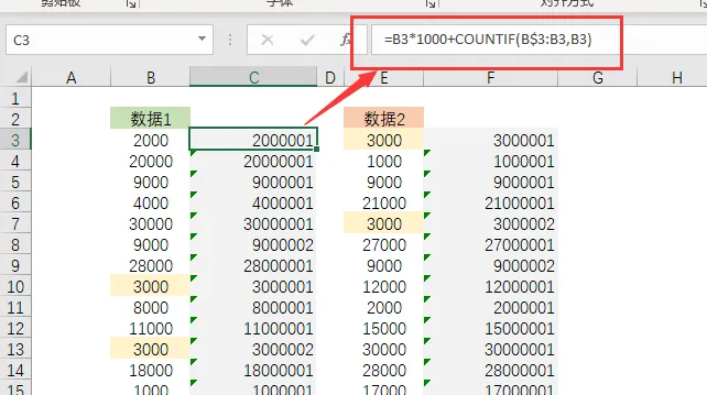 设置公式为:=B3*1000+COUNTIF(B$3:B3,B3)