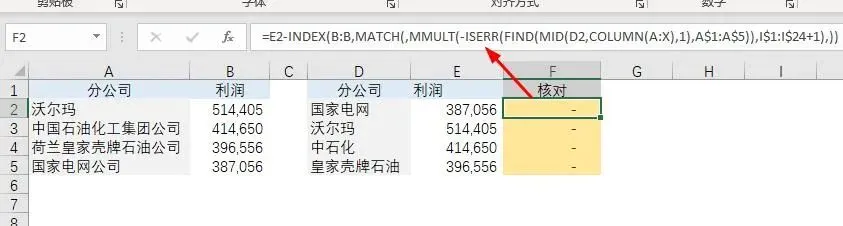 【例4】如下表,左表为全称,右表为简称。需要核对二者利润是否一致。