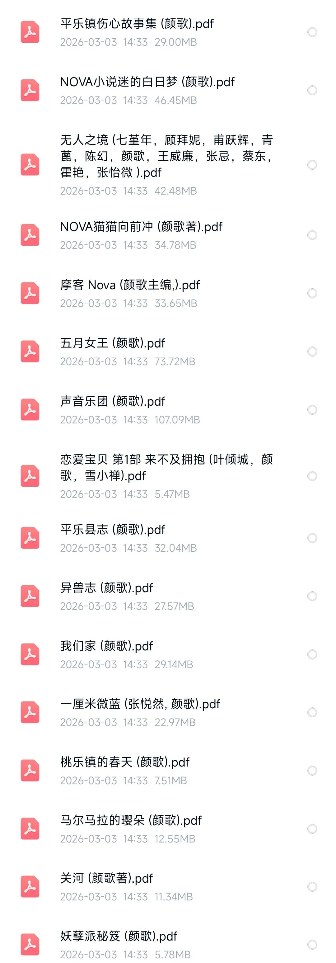 颜歌、林棹作品pdf 颜歌作品,电子书, pdf。 林棹,潮汐图,溪流,电子书,pdf。 平乐镇伤心故事集 NOVA小说迷的白日梦 无人之境 NOVA猫猫向前冲 摩客Nova 五月女王 声音乐团 恋爱宝贝 第1部 来不及拥抱 平乐县志 异兽志 我们家 一厘米微蓝 桃乐镇的春天 马尔马拉的璎朵 关河 妖孽派秘笈
