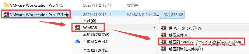 1.选中下载的压缩包,然后鼠标右键选择解压到“VMware Workstation Pro 17.5”(没有解压选项点这里)