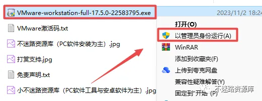 2.打开刚刚解压的文件夹,鼠标右键点击“VMware-workstation-full-17.5.0-22583795.exe”选择“以管理员身份运行”