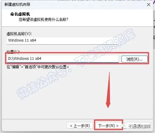 19.可自行修改虚拟机名称和位置,点击“浏览”选择安装路径,建议和教程中的保持一致,本例安装到D盘(将路径地址中的首字符C改为D表示安装到D盘,安装路径不要出现中文),点击“下一步“