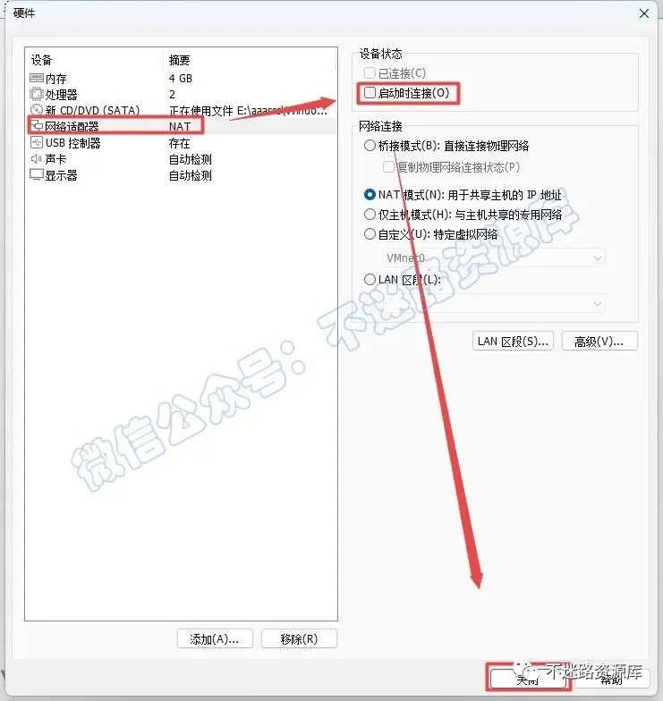 23.这里可以给虚拟机分配对应的选项,点击“网络适配器“,取消勾选“启动时连接”,点击“关闭“