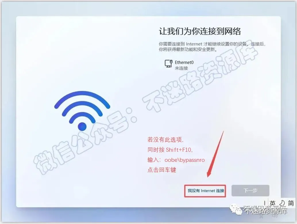 39.点击“我没有Internet链接”(若没有“我没有Internet链接”此项,请同时按住Shift+F10调用命令提示符,输入:oobe\bypassnro,点击回车(Enter)键)