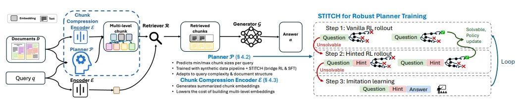 右侧:查询输入→规划器决策→动态分块→压缩检索→生成