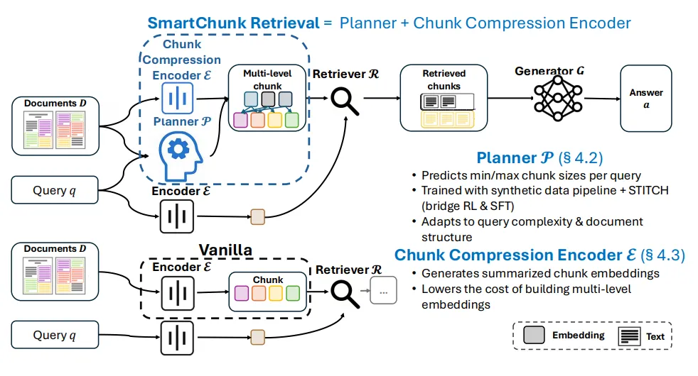 SmartChunk提出 “规划器+压缩器” 的双模块架构,实现检索粒度的实时自适应: