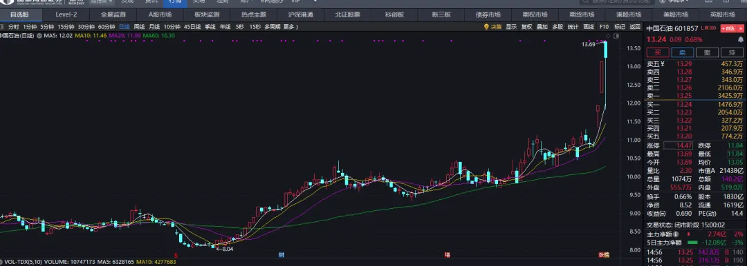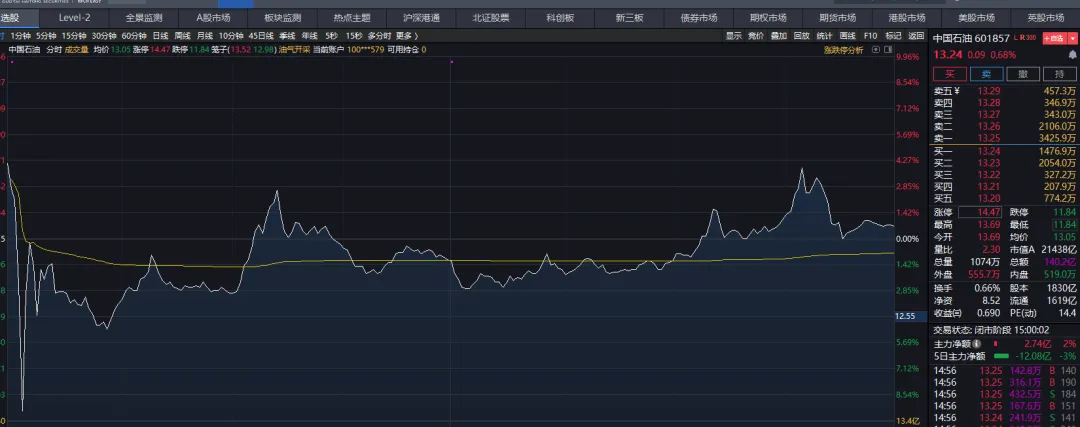 3月4日,中国石油早盘以13.69元高开后直线下坠,一度触及11.84元的跌停价位,让投资者陷入恐慌,纷纷跟风抛售。可谁也没想到,随后股价强势反弹拉升,最终收盘报13.24元,反而上涨了0.68%。