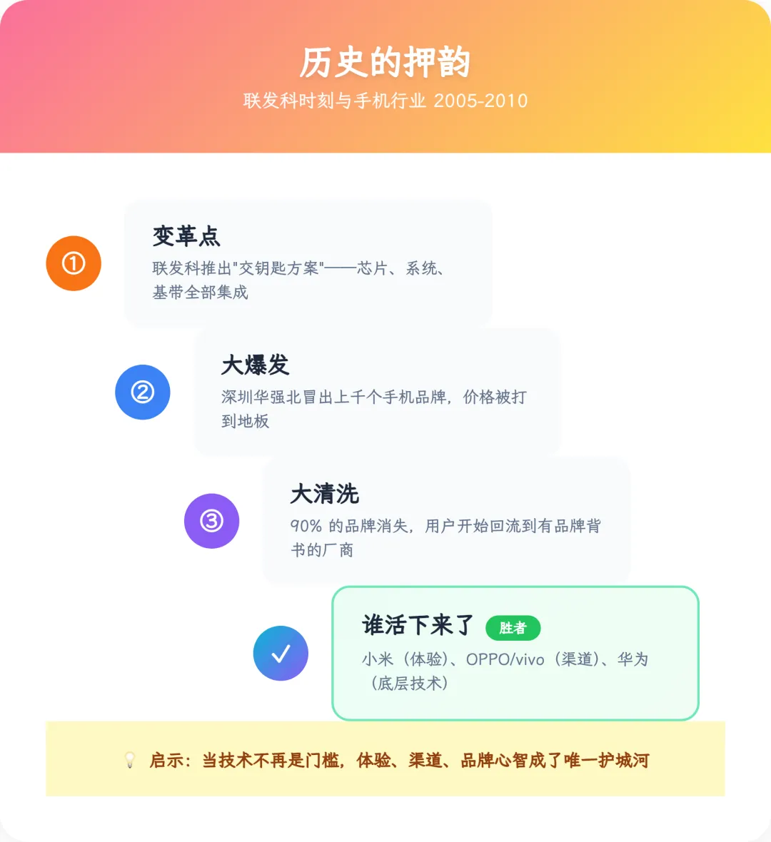2005-2010 年,联发科推出“交钥匙方案”——芯片、系统、基带全部集成好,手机厂商只需买个外壳配块屏。