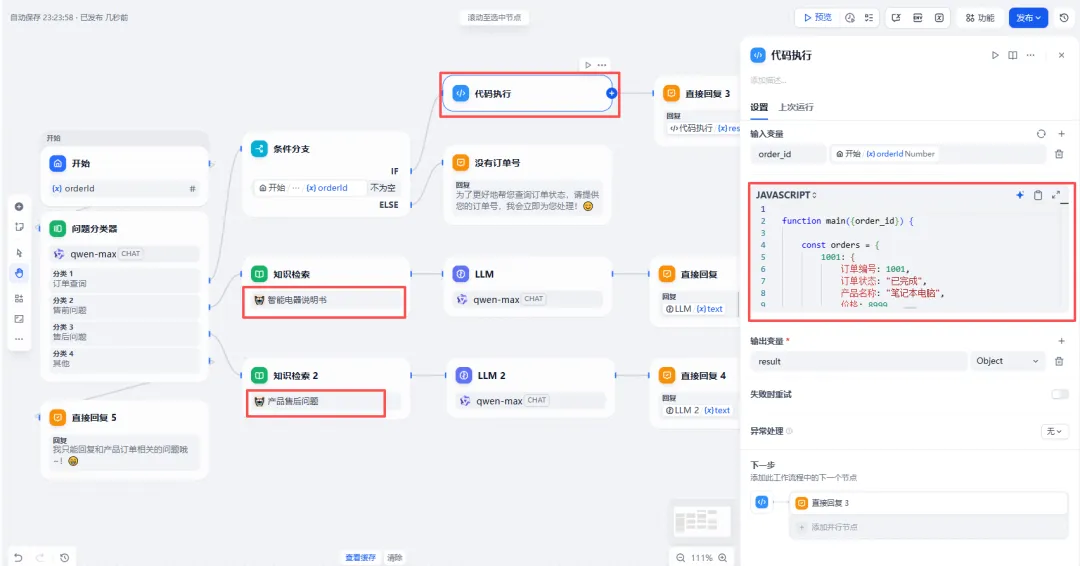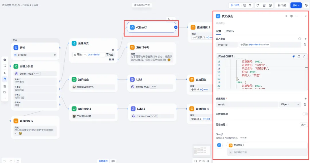 function main({order_id}) {const orders = {1001: {订单编号: 1001,订单状态: "已完成",产品名称: "笔记本电脑",价格: 8999,购买人: "张三"},1002: {订单编号: 1002,订单状态: "待发货",产品名称: "智能手机",价格: 4999,购买人: "李四"},1003: {订单编号: 1003,订单状态: "运输中",产品名称: "智能手表",价格: 1999,购买人: "王五"}};const order = orders[order_id];if (order) {var aa = { statusCode: 200, data: order };return {result: aa};} else {var bb = { statusCode: 400, message: "查无订单" };return {result: bb};}}
