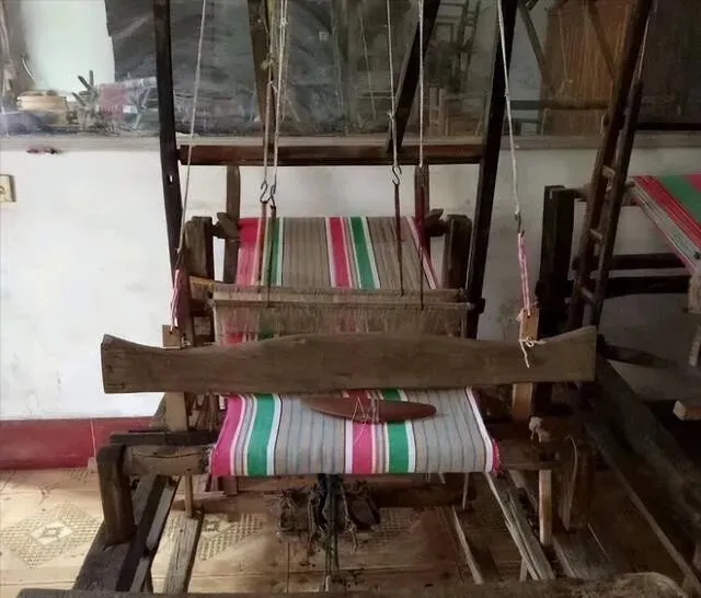 织布机必须提 , 奶奶那辈人 , 家家一台 , 咔嗒咔嗒响着 , 织出各种花样的老土布 , 做衣服做被子 , 全靠它。