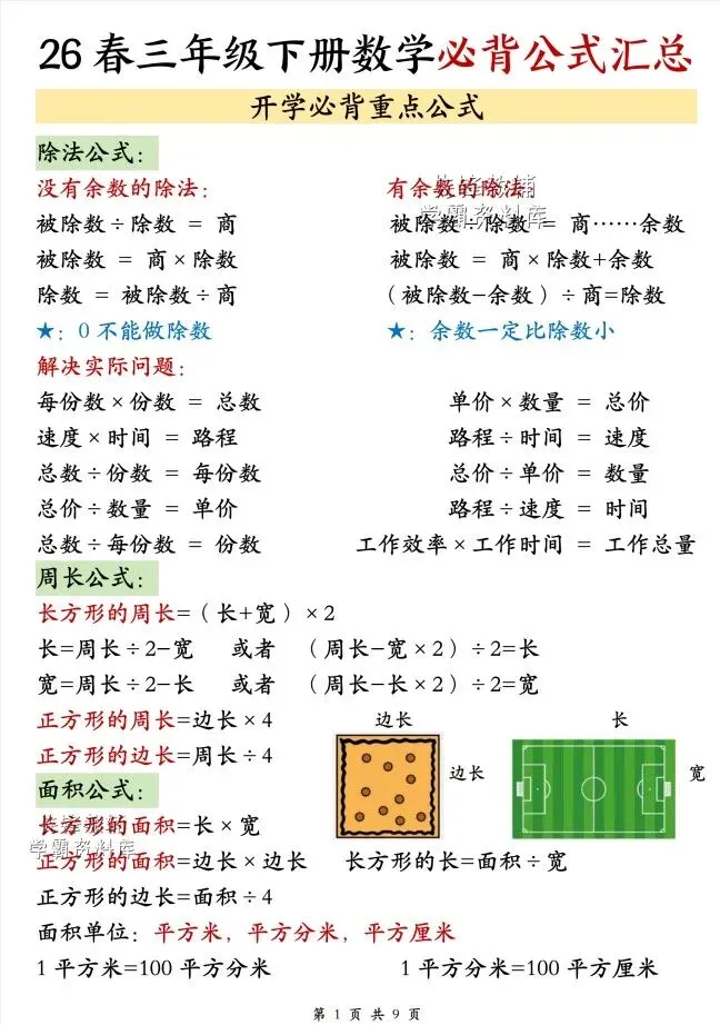 今天给大家整理了26春三年级下册数学必背公式汇总《人教版》,转发给朋友或班级群,受益更多人,帮助孩子学习!