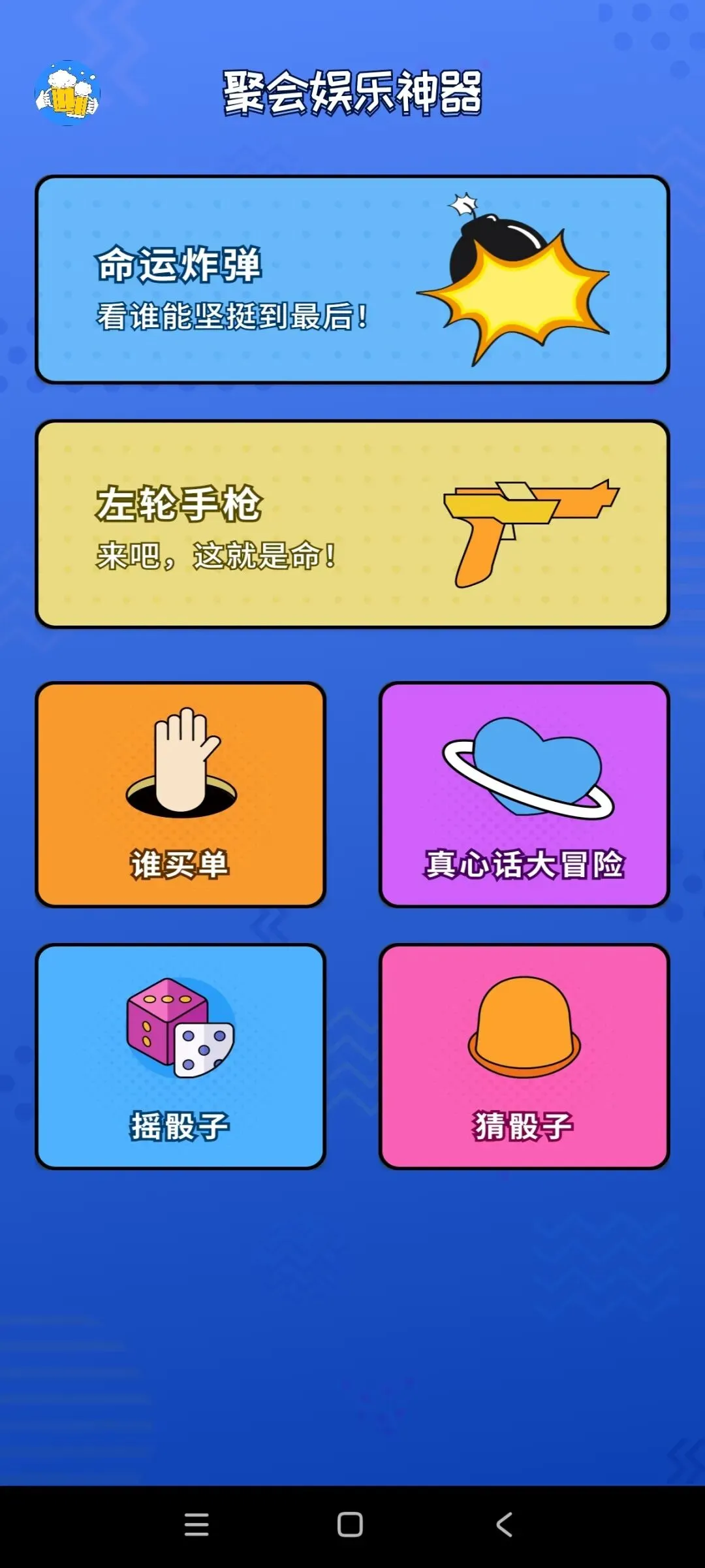 最戳人的就是它的趣味玩法,每一个都能点燃聚会热情✨ 谁来喝酒天注定,全程随机不套路,不用纠结谁先喝、喝多少,轻松化解选择困难;还有真话冒险小转盘,转到什么就做什么,惊险又刺激,看看谁能坚持到最后,解锁聚会隐藏乐趣!