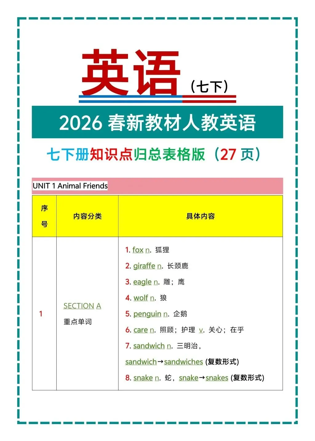 ❤️✅️今日资料:【七下英语】2026年春七年级初一下册人教版英语知识点总结27页,完整高清电子版可打印