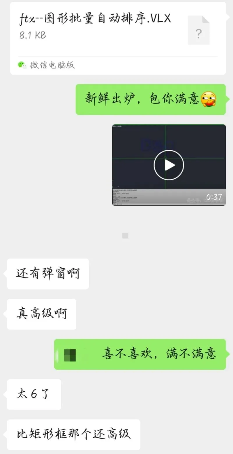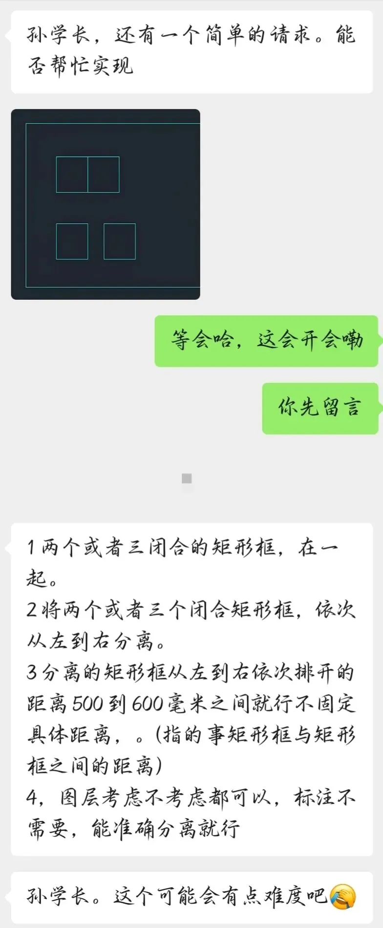 自写cad插件之封闭图形批量一键自动排序 cad插件是高效使用CAD的灵魂 –CAD孙学长 该cad插件获取方式在文末 经常鼓励孙学长坚持的朋友提出需求: 难不难度不重要,重要的是孙学长已经开始开发… 优化多次后 终于达到了完美的效果: 💡 适用场景: 排列不同形状的图形 排列图框 更多使用场景等待朋友们发现 …… 命令FTX(分开图形)展示效果如下: 已关注 关注 重播 分享 赞 视频详情 获取方式一: 先关注。因为关注私信后孙学长才可以主动发起私信,发送插件。 评论区留言后,孙学长择机一对一分享【密享】链接,限制访问1人,有效期1天,需要及时保存。适合不着急使用的朋友。 获取方式二: 赞赏。文末红色的“喜欢作者”,可设置任意金额。 赞赏后自动下发插件的百度网盘链接,及时高效无限制。 获取方式三: 详见感谢大家支持,关注顺利突破100。 勿让插件在收藏夹吃灰,用到哪个分享哪个 朋友若是愿意,辛苦点击文末广告,让孙学长挣个广告费