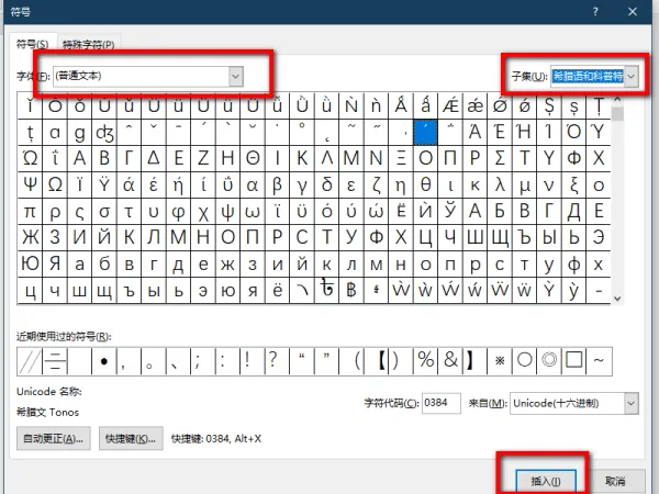 5、弹出界面点击字体选择希腊字体,找到需要的字母点击插入即可。