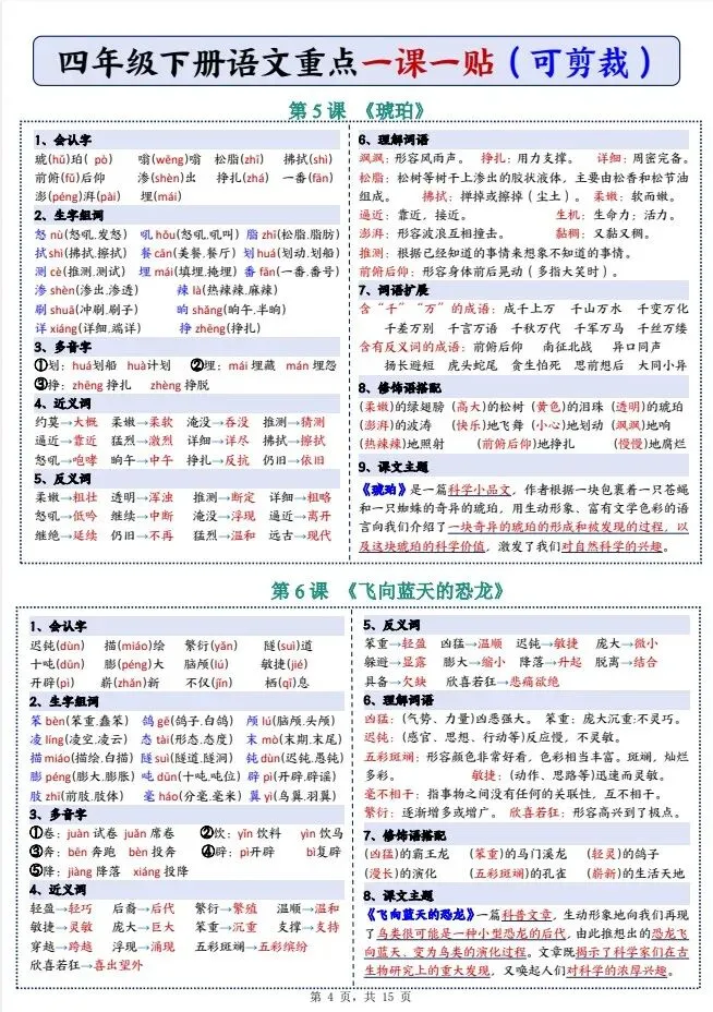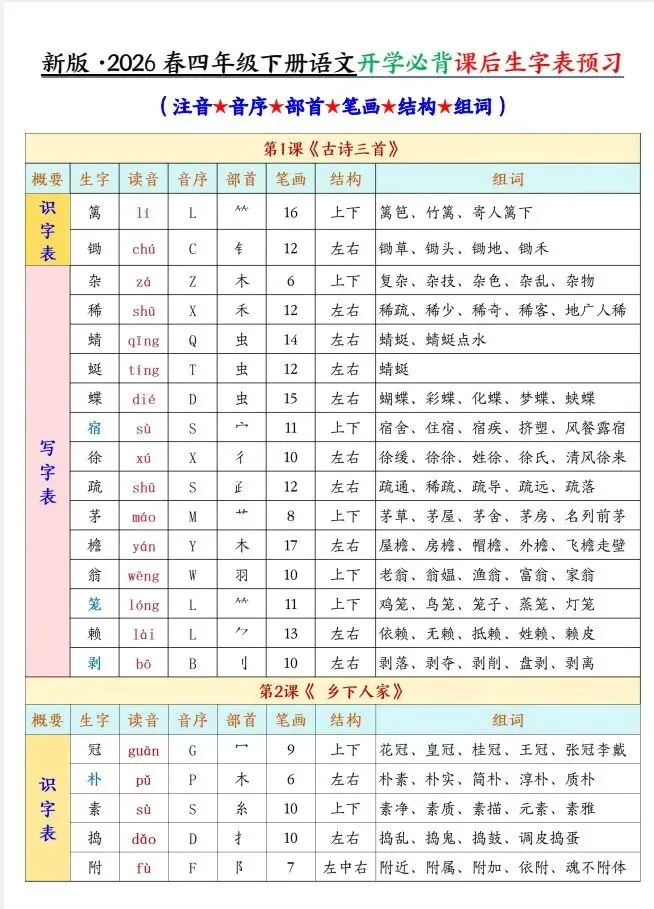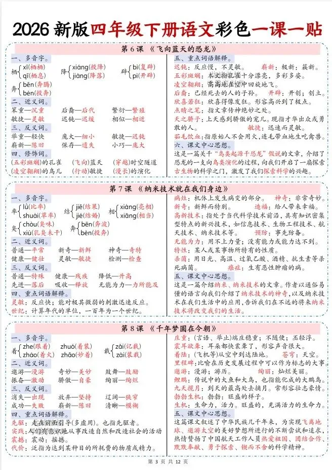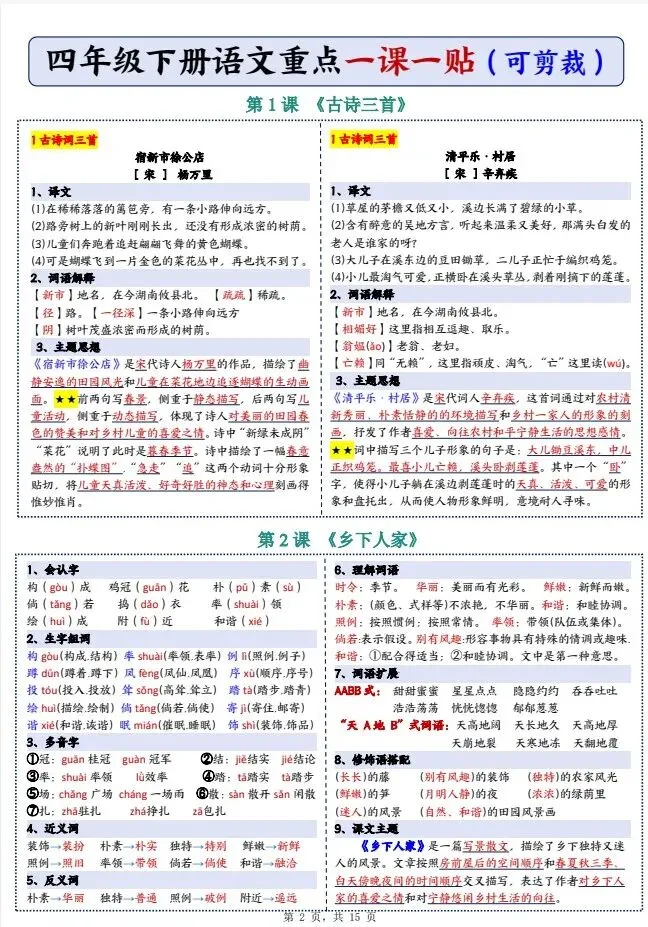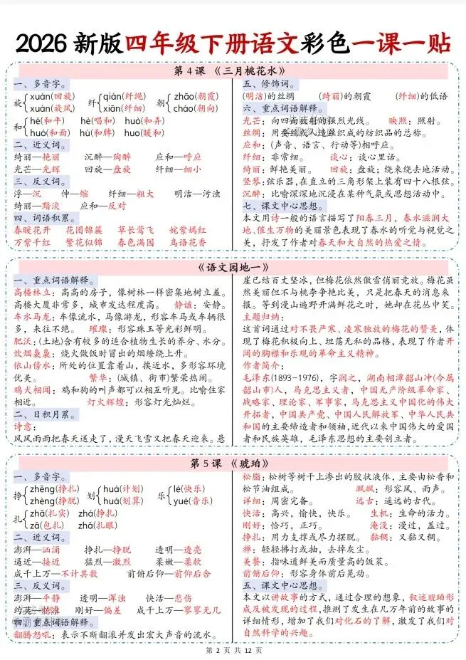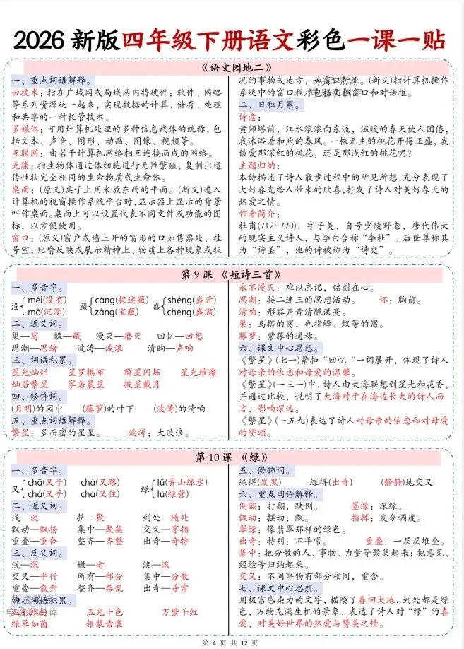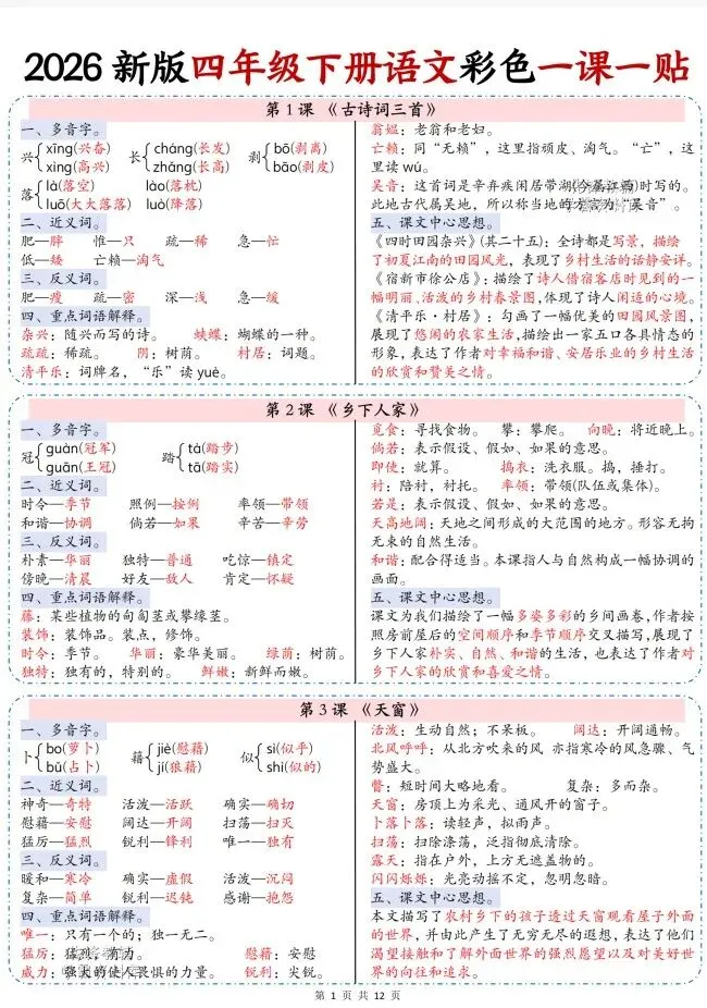 今天给大家整理了26春四年级下册语文彩色一课一贴【多版本】,转发给朋友或班级群,受益更多人,帮助孩子学习!