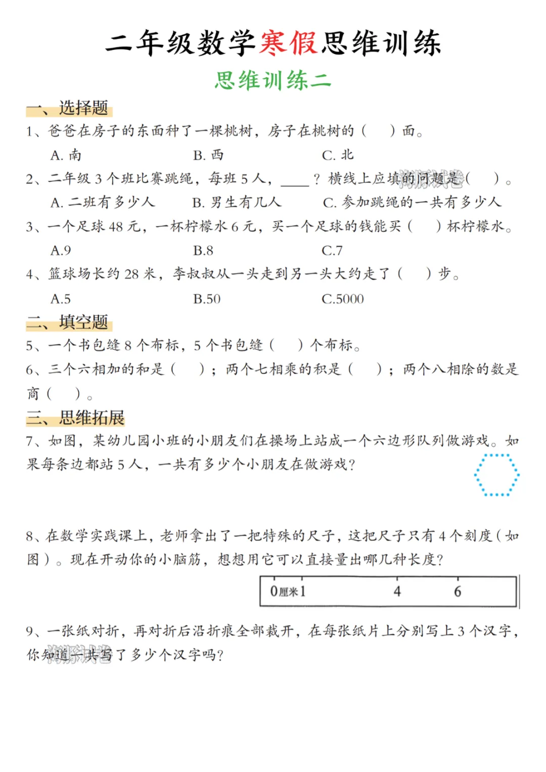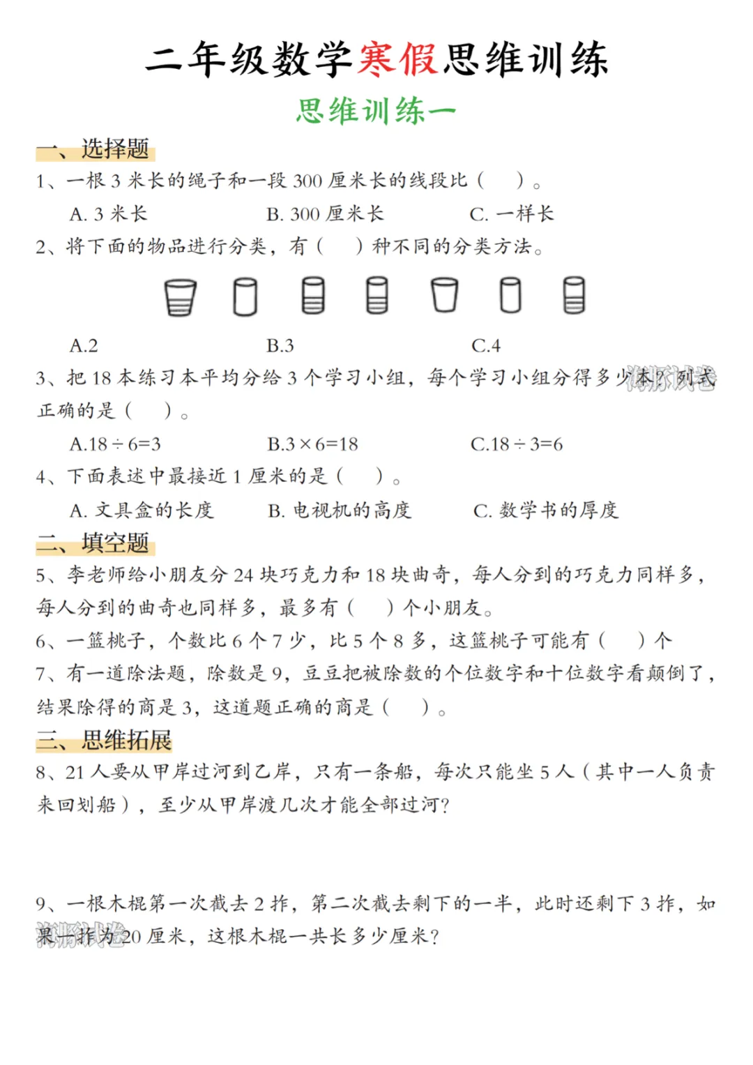 【免费下载】二年级数学寒假思维训练,PDF电子版,共15页,可打印