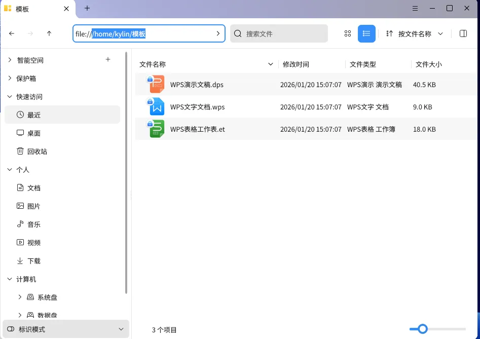 1.模板保存路径:/home/用户名/模板(重点提醒:一定要选对路径,“用户名”替换成自己的系统登录账号,比如你的账号是“kylin”,路径就是/home/kylin/模板);