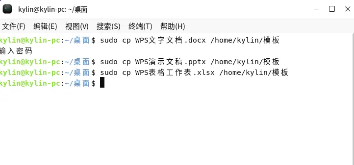 3. 终端中使用图示cp命令将桌面新建的模板拷贝过去(输入密码不显示);